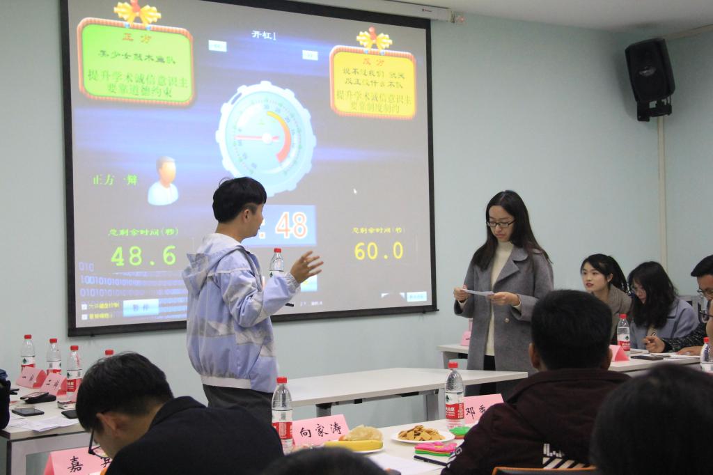 本次学术奇葩说活动辩论的主题是“提高学术诚信意识,主要靠道德约束还是制度制约?”,既充分契合第九期“学术诚信”活动主题,又贴近研究生的实际学习生活,吸引了不少观众到场支持。正方“美少女敲木鱼”队认为提高学术诚信意识主要靠道德制约,反方“说不过我们就哭反正也没什么不”队则认为制度制约更有效。