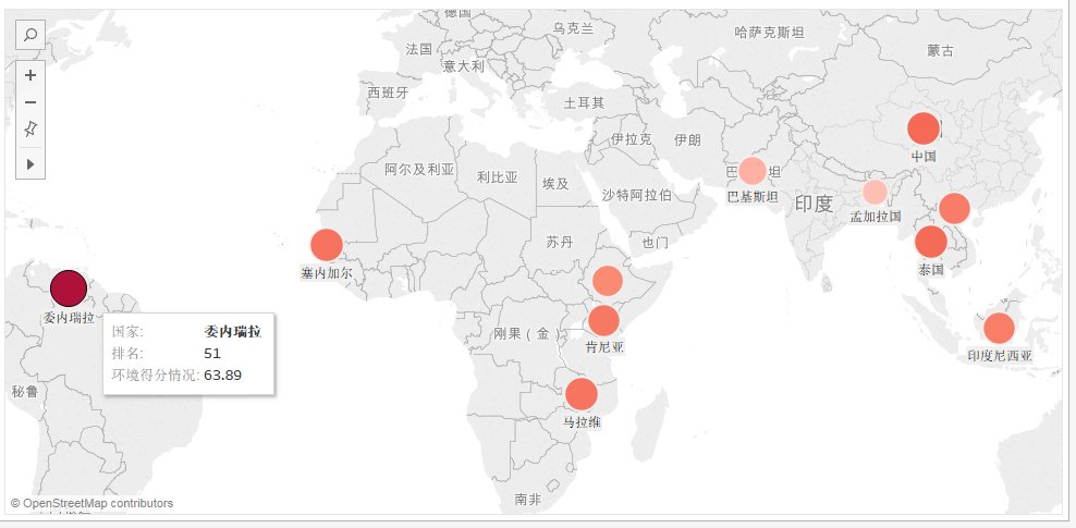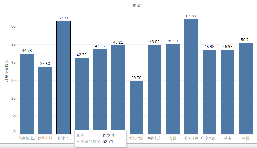 由上图可以看出,在这13个国家中,排名最高的是委内瑞拉,在报告中涉及的180个国家中排名第51位,得分为63.89,巴拿马的得分为62.71,在13个国家中排名第二。除了以上两个国家外,包括中国在内的11个国家得分均低于60,排名比较靠后,环境质量较差,其中,孟加拉国的得分为29.56,环境质量最差。