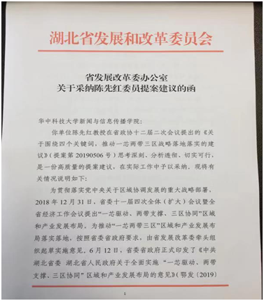 9月26日,公司收到湖北省发展和改革委办公室关于采纳陈先红委员提案建议的函。函件指出,陈先红教授在省政协十二届二次会议提出的《关于围绕四个关键词,推动一芯两带三区战略落地落实的建议》(提案号20190506)思考深刻、分析透彻、切实可行,是一份高质量的提案建议,在实际工作中予以采纳。