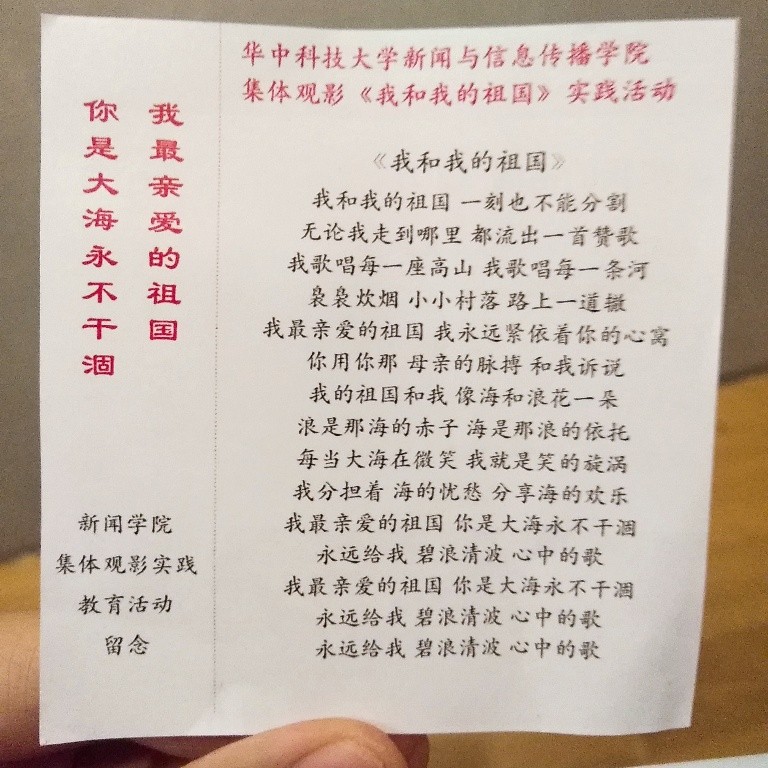 通过此次“不忘初心、牢记使命” 庆祝新中国成立70周年集体观影《我和我的祖国》主题教育实践活动,师生们共同回顾了70年来新中国砥砺前行、不断发展的奋斗历程和峥嵘岁月,在金秋十月为祖国庆生。在未来的日子里,也将以更好地姿态、更昂扬的风貌投身于学习和生活中,与祖国同呼吸、共命运。