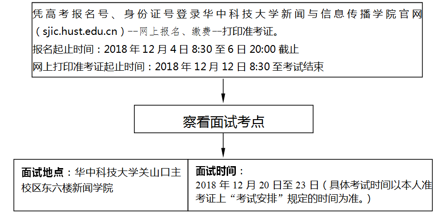 取得艺术类高考报名号并完成高考报名的考生,于2018年12月4-6日(12月4日8:30开始,12月6日20:00截止),凭高考报名号及身份证号登录bw必威西汉姆联官方网站官网(网址sjic.hust.edu.cn),进行专业统考报名,填报相关信息并完成网上缴费。网报结束后,系统将自动关闭,未在规定时间内完成网上报名及网上缴费的,视为未报名,不予安排考试。