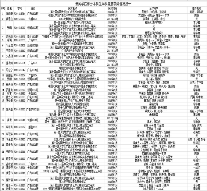 在全国老员工广告艺术大赛中,16级新闻班张萌、罗星言、16级广告班文鑫玥、董凌峰同学等人分别获全国赛区广播类优秀奖、策划类优秀奖,湖北赛区广播类一、二、三等奖,策划案类一、二、三等奖。