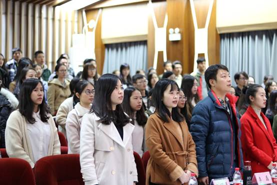 典礼开始,全场起立合唱国歌。随后,入党积极分子们以小组为单位,围绕“聚焦十九大,共筑中国梦”的主题,以多种多样的形式,展示了课外主动学习党的理论知识、积极关注时政热点的成果,为大家展现了十八大以来,在党的领导下,我国所取得的辉煌成就,以及他们对十九大精神的理解和感受。