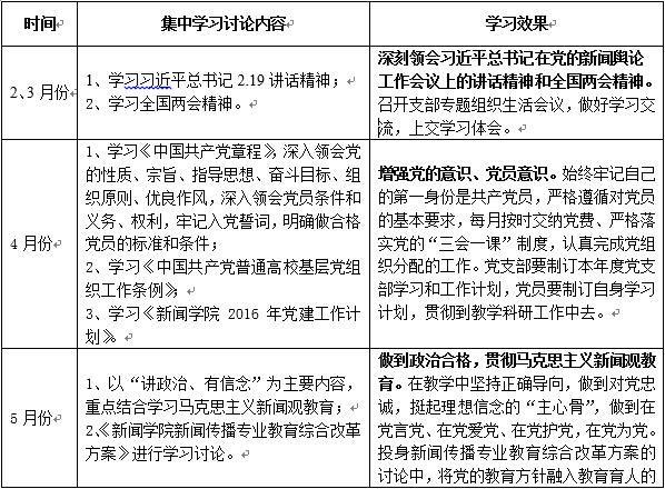 8月份 | 1、走访交流学习,采取灵活形式开展组织生活。主要学习内容为马克思主义新闻观教育相关课程建设、民主决策能力、国际化人才培养等方面。 | 将教育学习思想转化为实际工作思路。深入研讨高等教育办学规律和新闻传播人才成长规律,破除老旧思想,充分征求和听取群众意见,提升国际化办学水平。 |
