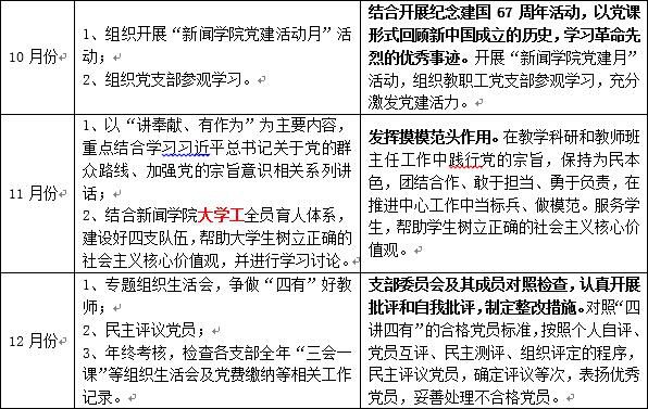 11月份 | 1、以“讲奉献、有作为”为主要内容,重点结合学习习近平总书记关于党的群众路线、加强党的宗旨意识相关系列讲话; 2、结合bw必威西汉姆联官方网站大学工全员育人体系,建设好四支队伍,帮助老员工树立正确的社会主义核心价值观。 | 发挥模范带头作用。深入贯彻党的群众路线,践行党的宗旨,立足岗位服务群众,敢于担当、勇于负责,在新闻传播人才培养过程中,搭建队伍形成合力。 |
