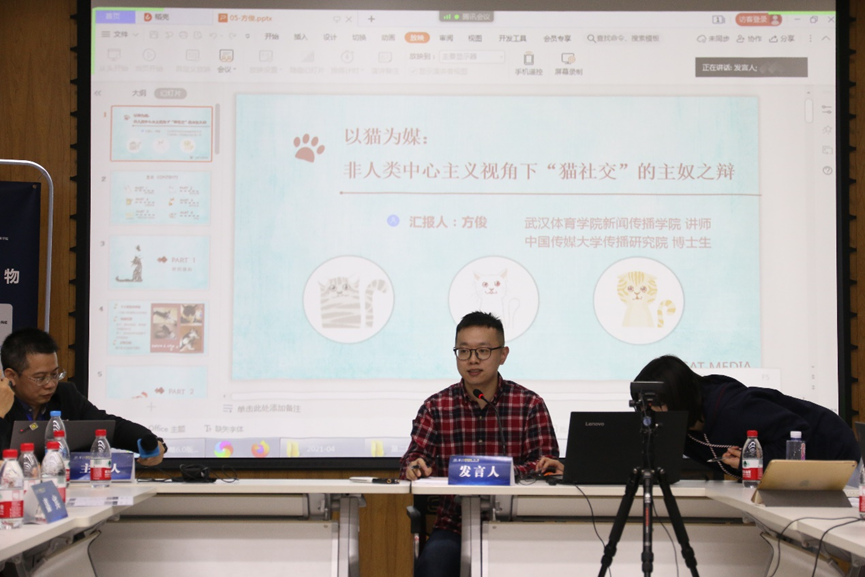 武汉体育公司新闻传播公司讲师、中国传媒大学传播研究院博士生方俊发言的题目是《以猫为媒:非人类中心主义视角下“猫社交”的主奴之辩》,他指出在万物为媒的环境中,猫不仅仅是可爱的萌宠,也成为一种新兴的社交媒介。“以猫为媒”影响着人们的社会交往行为与生活方式,人与社交被驯化了。
