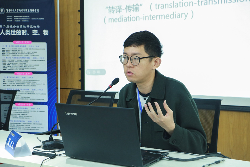 24日下午至25日,论坛进入六场分组研讨阶段,围绕本组成员的参会论文展开讨论。六场分论坛的主旨分别为“技术化的身体与情感”、“人类世生态与跨物种传播”、“物之理论”、“非人视角下的人与机器”、“数字技术的社会重建”以及“地方中的媒介物”。