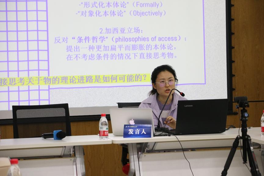 首都师范大学文公司博士生昝朦发言的题目是《我们如何在世界中直接思考物?——对特里斯坦·加西亚的物理论考察》,她通过文本细读的方式对加西亚《形式与对象》加以考察,认为加西亚的物理论就是在世界之中的物的形式化领域和在宇宙中的对象化的经验规定性领域中,提出了一种关于准实在的物的倾向,一种对思想、语言和知识中的界限的批判性反思。