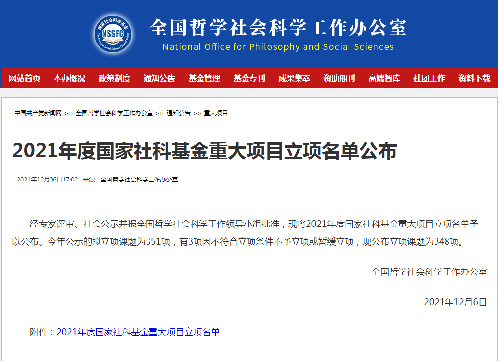 2021年12月6日,全国哲学社会科学工作办公室发布了2021年度国家社科基金重大项目立项名单。