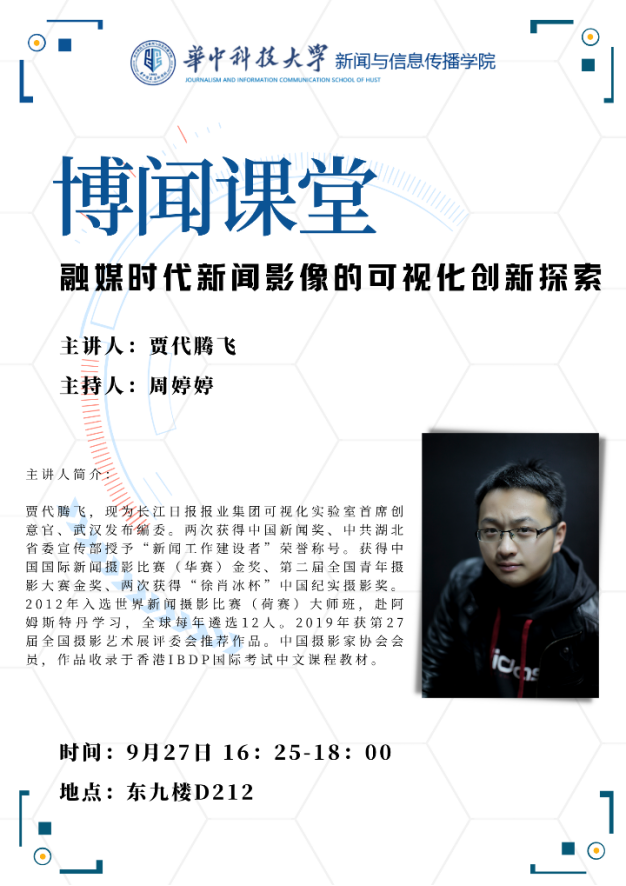 9月27日下午,长江日报报业集团可视化实验室首席创意官、武汉发布编委贾代腾飞20级新闻系同学带来了主题为融媒时代新闻影像的可视化创新探索”的专题讲座。讲座由bw必威西汉姆联官方网站新闻系主任周婷婷主持