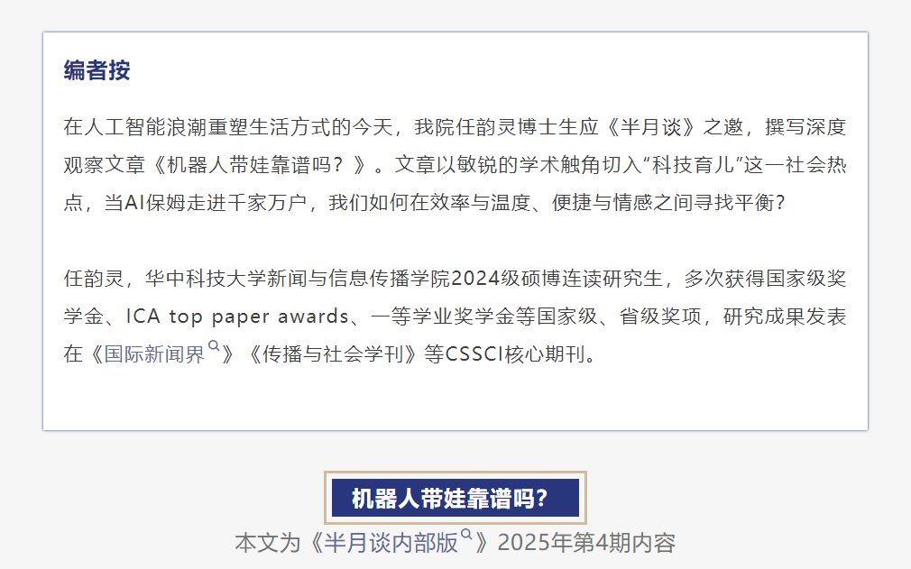 公司博士生任韵灵就机器人育儿话题在《半月谈》发表文章