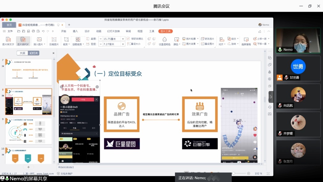 余巧楠学姐结合自己在互联网游戏行业的实践经验,与同学们分享了面对抖音短视频爆发如何寻求用户新增长的逻辑,分享了业界的内容创意生产过程、定位目标受众与广告优化效果等经验知识讲,座干货满满,为同学们提供了不同的观察视角。。