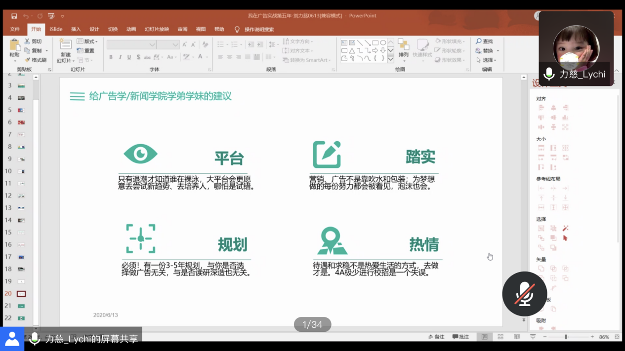 刘力慈学姐大学毕业后就深耕于广告行业,拥有丰富的广告理论知识和项目实操经验。刘力慈学姐将专业磨砺和个人规划建议作为切入口,为同学们展示了什么是广告公司?在广告公司工作的工作内容是什么?广告公司发展前景以及给学弟学妹的建议。干货满满,同学们积极提问,收获颇丰。