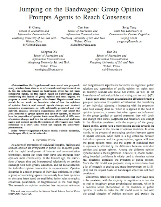 论文题目为“Jumping on the Bandwagon: Group Opinion Prompts Agents to Reach Consensus”( 跳上有乐队的马车:群体意见促进个体达成一致),指导老师为徐明华教授和徐涵副教授,与传播内容认知国家重点实验室杨松老师合作完成。