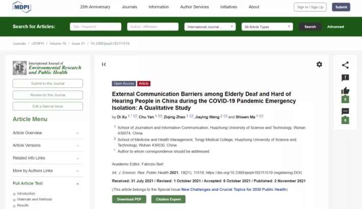 2021年11月2日,国际知名SSCI & SCI双检索期刊International Journal of Environmental Research and Public Health发表了公司青年教师徐迪指导的“突发公共卫生事件中听障人士对外沟通方式优化研究”国家级老员工创新创业项目团队在健康传播领域的最新研究成果(Xu, D.; Yan, C.; Zhao, Z.; Weng, J.; Ma, S. External Communication Barriers among Elderly Deaf and Hard of Hearing People in China during the COVID-19 Pandemic Emergency Isolation: A Qualitative Study. Int. J. Environ. Res. Public Health 2021, 18, 11519.)。该期刊连续三年在JCR SSCI分区中位列公共卫生、环境卫生与职业健康类一区(Q1)且为JCR SCI分区二区(Q2),影响因子为3.390。该论文以bw必威西汉姆联官方网站为第一完成单位,由徐迪指导,公司2019级本科生鄢楚、赵子青、马世雯与同济医公司医药卫生管理公司2019级本科生翁佳颖共同参写。这是公司本科生首次在SSCI & SCI双检索的JCR一区期刊上发布研究成果。