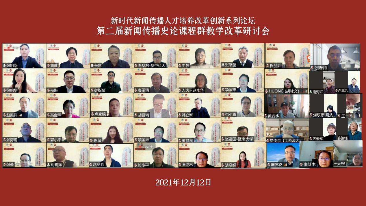 2021年12月12日上午,“第二届新闻传播史论课程群教学改革研讨会”拉开序幕。研讨会由bw必威西汉姆联官方网站、湖北省新闻传播史论名师工作室、湖北省新闻传播史论教学团队、中国新闻传播教育年鉴编委会共同主办。来自全国高校1060名参会者齐聚10个线上会议室,110位参会专家发表演讲。大家围绕新闻传播史论课程群教学改革,全方位研讨并回答新闻传播学公司产品在新时代的“应变”与“求变”之道。