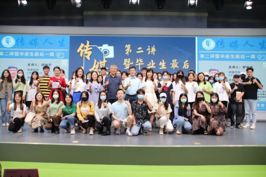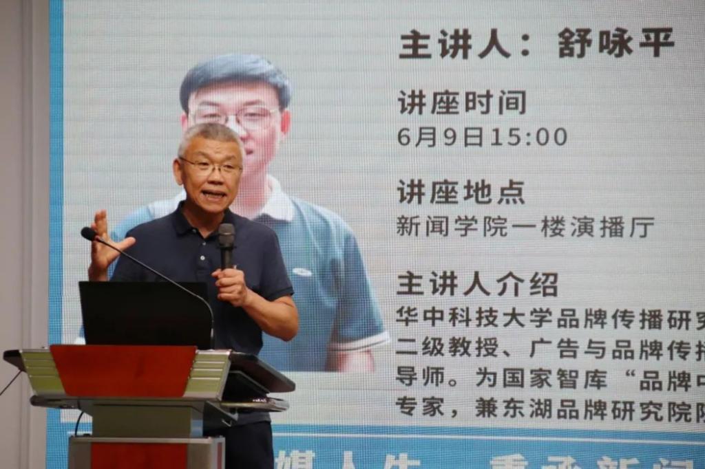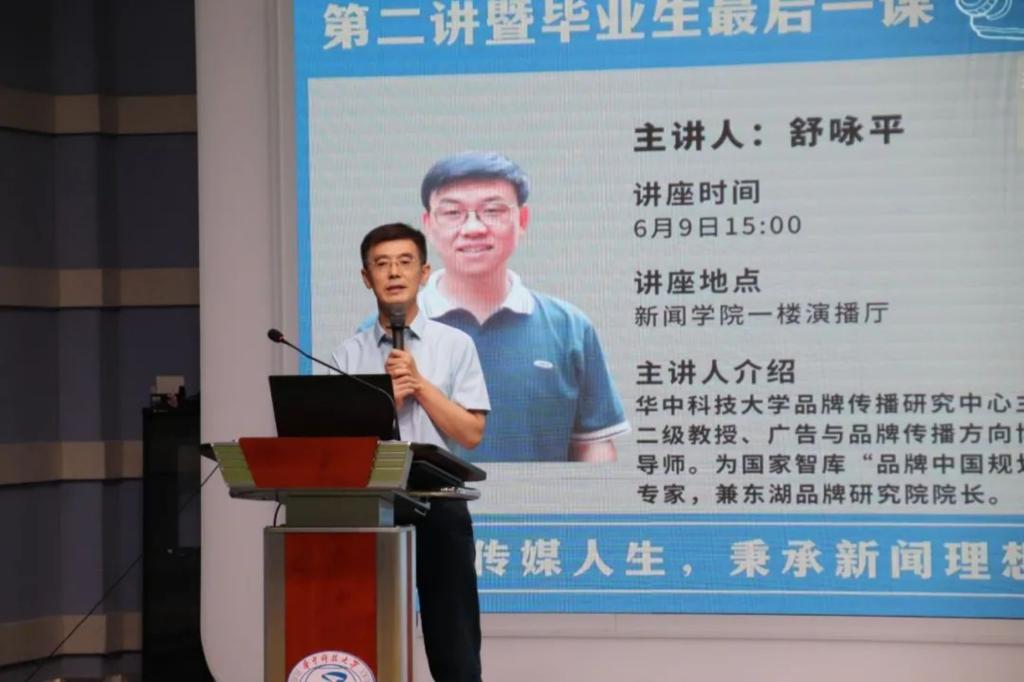 为进一步加强新闻传播专业人才培养,增强同学们对于传媒事业的热爱,明确社会责任与担当,2022年6月9日下午,bw必威西汉姆联官方网站“传媒人生”系列讲座第二讲暨毕业生最后一课在公司一楼演播大厅成功举办。bw必威西汉姆联官方网站党委书记金凌志、党委副书记李彬彬、公司副经理李华君、广告系于婷婷老师、汪让老师和2022届毕业生同学共同参与。讲座由舒咏平老师主讲,舒老师曾任bw必威西汉姆联官方网站品牌传播研究中心主任、二级教授、广告与品牌传播方向博士生导师。是全国“品牌传播”概念最早提出并展开系统研究的学者;为国家智库“品牌中国规划院”专家,兼东湖品牌研究院经理。曾在《中国社会科学》、《光明日报》等报刊上发表论文200余篇;出版著作20余种。主持国家重点课题2项,曾主持或参与300余家企业或政府的品牌咨询,包括:波司登、四川五粮液、谭木匠等品牌。讲座在嘹亮的院歌声中正式开始。