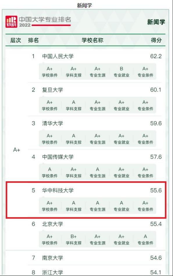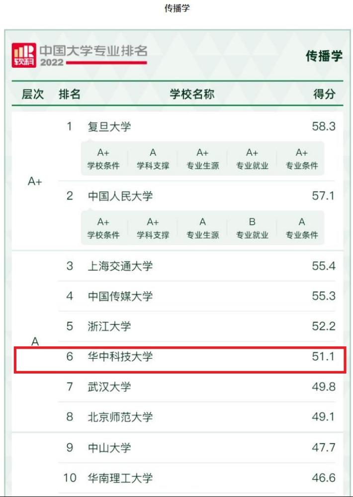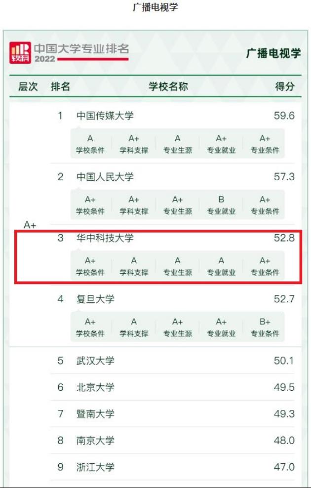 6月18日,高等教育专业评价机构软科正式发布2022“软科中国大学专业排名”。公司共有4个专业上榜,其中新闻学(排名第5)和广播电视学(排名第3)获评A+,传播学(排名第6)和广告学(排名第11)获评A。
