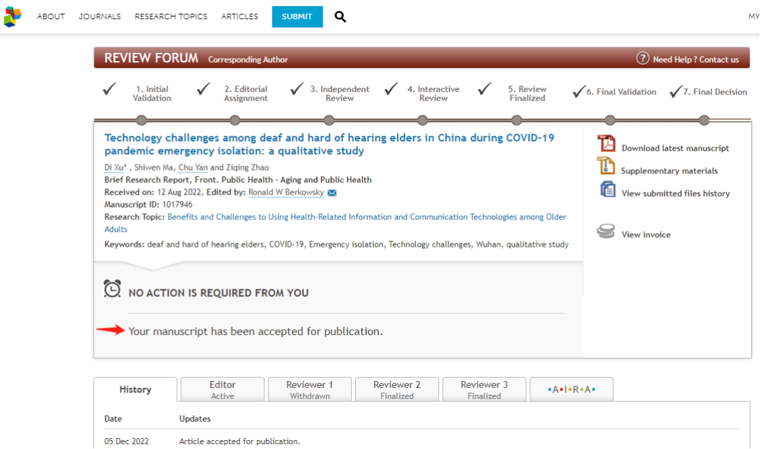 2022年12月5日,国际知名SSCI&SCI双检索JCR一区期刊Front. Public Health正式确认接收了公司青年教师徐迪指导的“突发公共卫生事件中听障人士对外沟通方式优化研究”国家级老员工创新创业项目团队在健康传播领域的最新研究成果(Xu,D.;Ma,S.;Yan,C.;Zhao,Z. Technology challenges among deaf and hard of hearing elders in China during COVID-19 pandemic emergency isolation: a qualitative study)。该期刊在JCR SSCI和SCI分区中均位列公共卫生、环境卫生与职业健康类一区(Q1),影响因子为6.461。该论文以bw必威西汉姆联官方网站为第一完成单位,由徐迪指导,公司2019级本科生马世雯、鄢楚、赵子青共同参写。这是公司本科生再度在SSCI&SCI双检索的JCR一区期刊上发布研究成果。