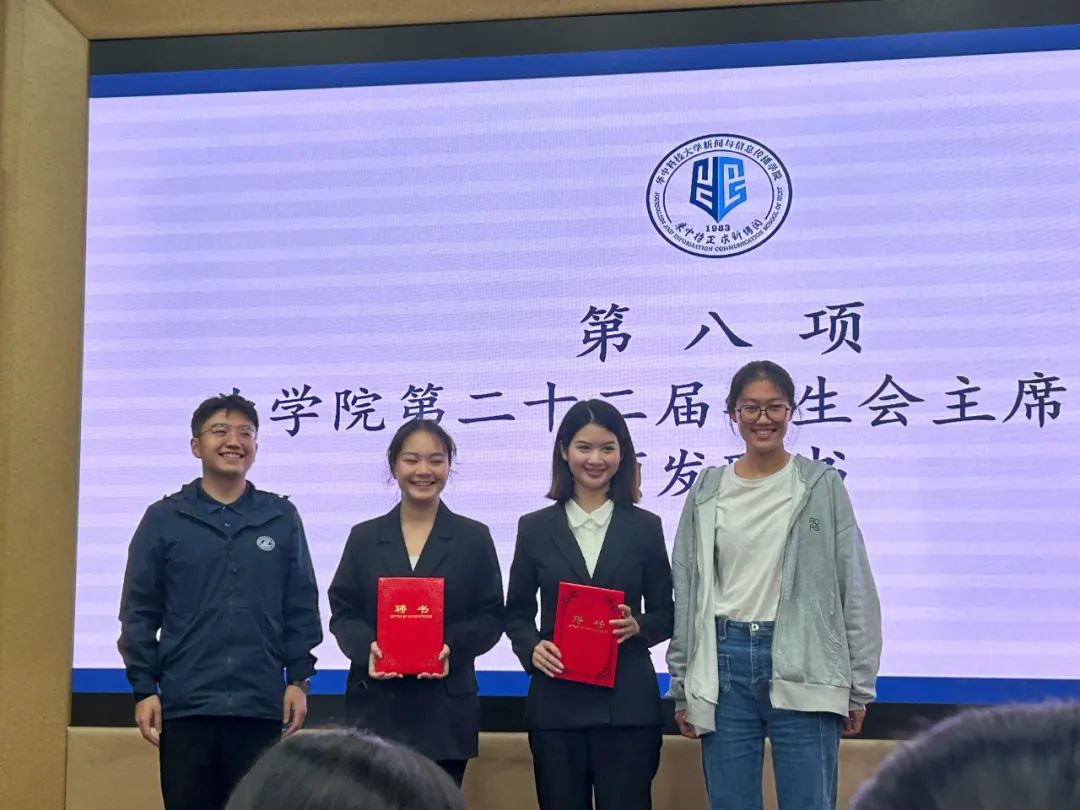 校团委员工兼职副书记叶涛,校员工会主席团成员谢雨霏为公司第二十二届员工会主席团成员颁发聘书。