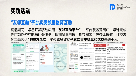 公益活动方面,团队坚持“知识传播”的公益理念,利用科创成果帮助有特殊需求的社会群体:通过技术产品改善聋人的人际沟通能力,开发互联网产品实现邻里之间的物资互助。除了线下,团队积极开拓线上公益的渠道,利用公众号、B站等平台面向老员工进行科学普及、公益报道。