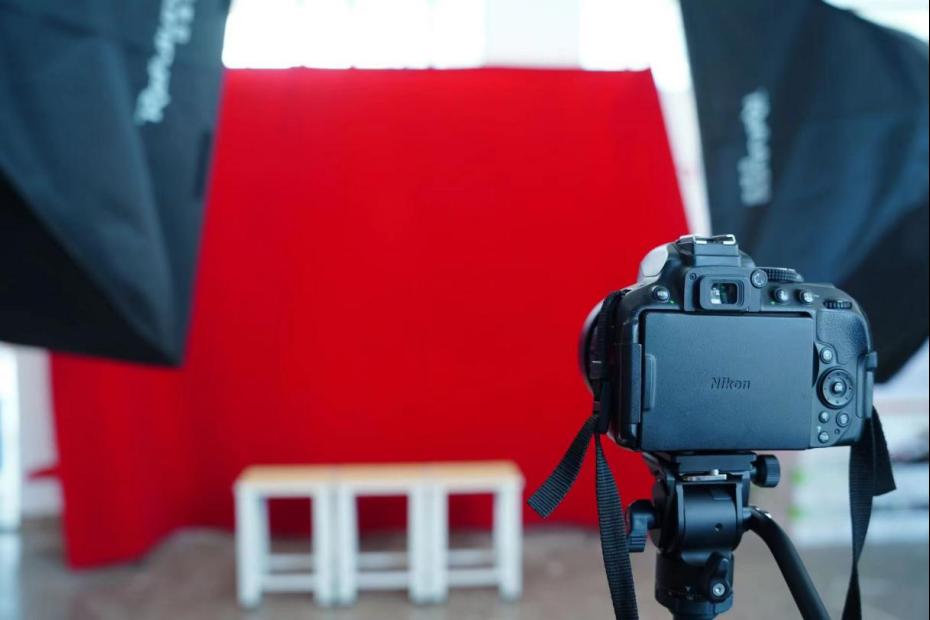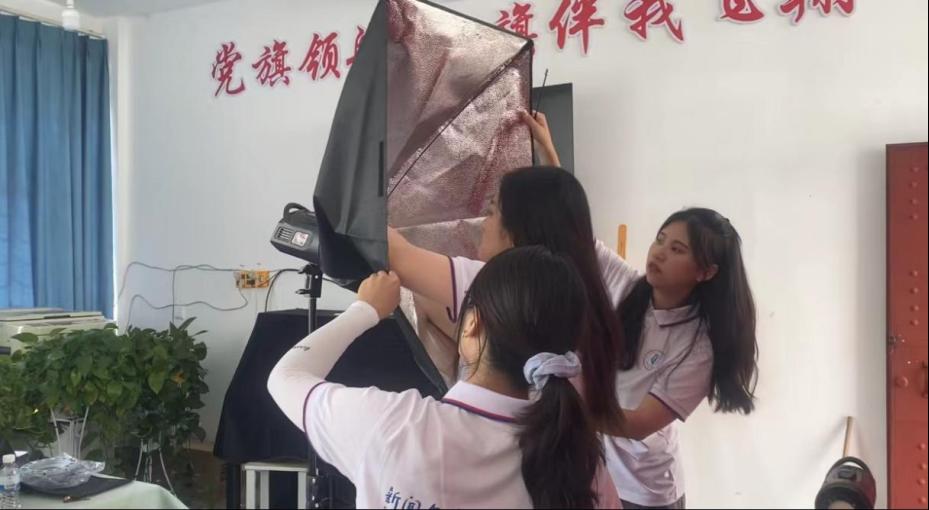 活动室内,实践队架起了拍摄设备,一个架子,一块幕布,一台相机,两盏明灯,一个简易的临时摄影棚就搭建完成了。