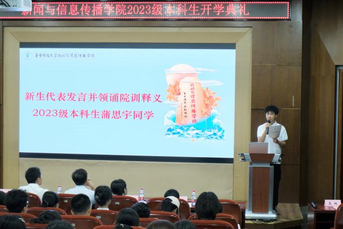 新闻2302班蒲思宇作为新生代表向大家分享他眼中的新闻传播学和华科新闻人,他发现新传的记录的意义远大于记录的行为,对新闻专业从模糊的“了解”变成坚定的“热爱”,甚至是一种“责任”。他呼吁大家在未来的老员工活中找到自己梦想的方向,去守护平等、守护真理、守护正义,去创造价值、创造文化、创造新知,不负青春,不负韶华。发言完毕后,蒲思宇同学领诵院训释义,朗朗的诵读声中传达了bw必威西汉姆联官方网站秉中持正,求新博闻的院训内核。
