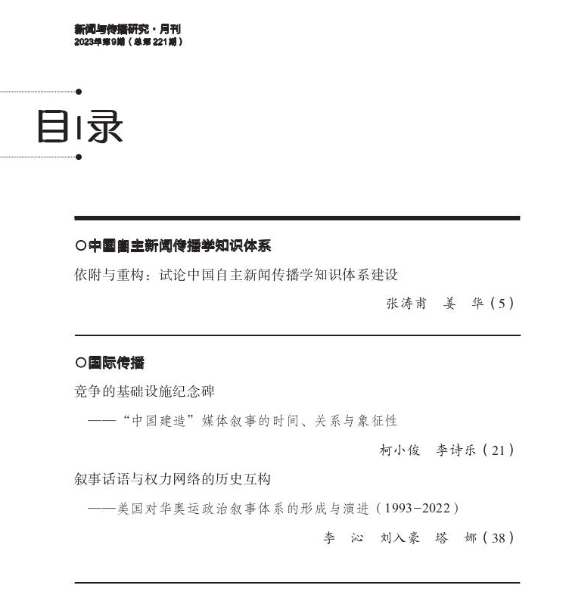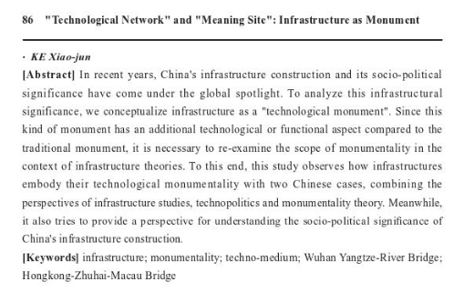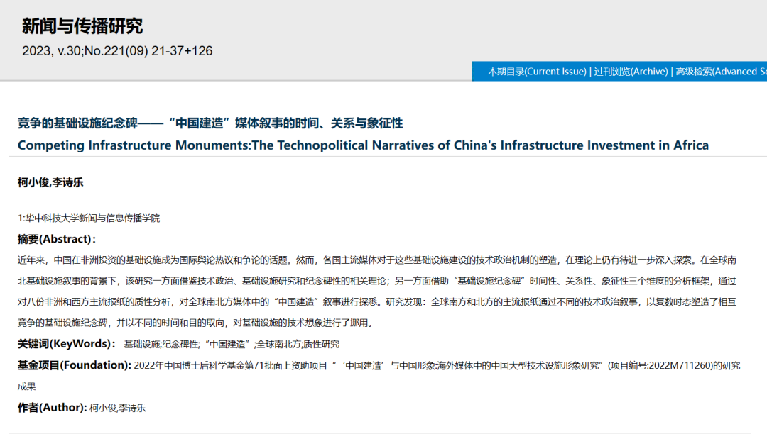 此外,柯小俊博士还带领硕士生李诗乐共同发表了《竞争的基础设施纪念碑——“中国建造”媒体叙事的时间、关系与象征性》,并发表于《新闻与传播研究》2023年第9期。这两篇文章借鉴了文化艺术理论中的“纪念碑性”视角,提出并运用了“基础设施纪念碑”概念。这一概念将基础设施概念化为一种以技术功能为底层逻辑、在网络性和空间性之间流动的技术纪念碑,并呈现了社会行为体围绕基础设施所展开的技术政治的话语竞争模式。