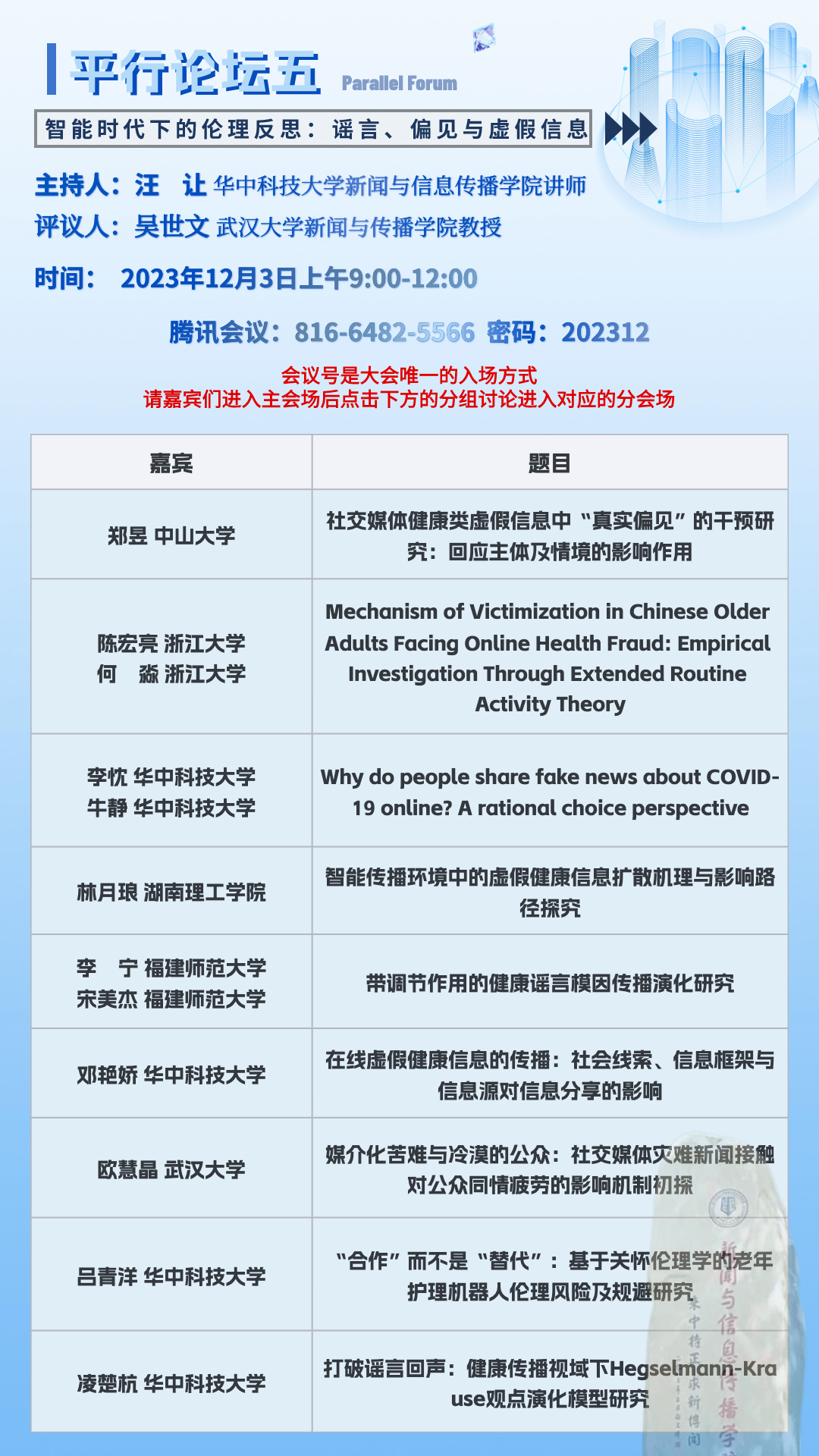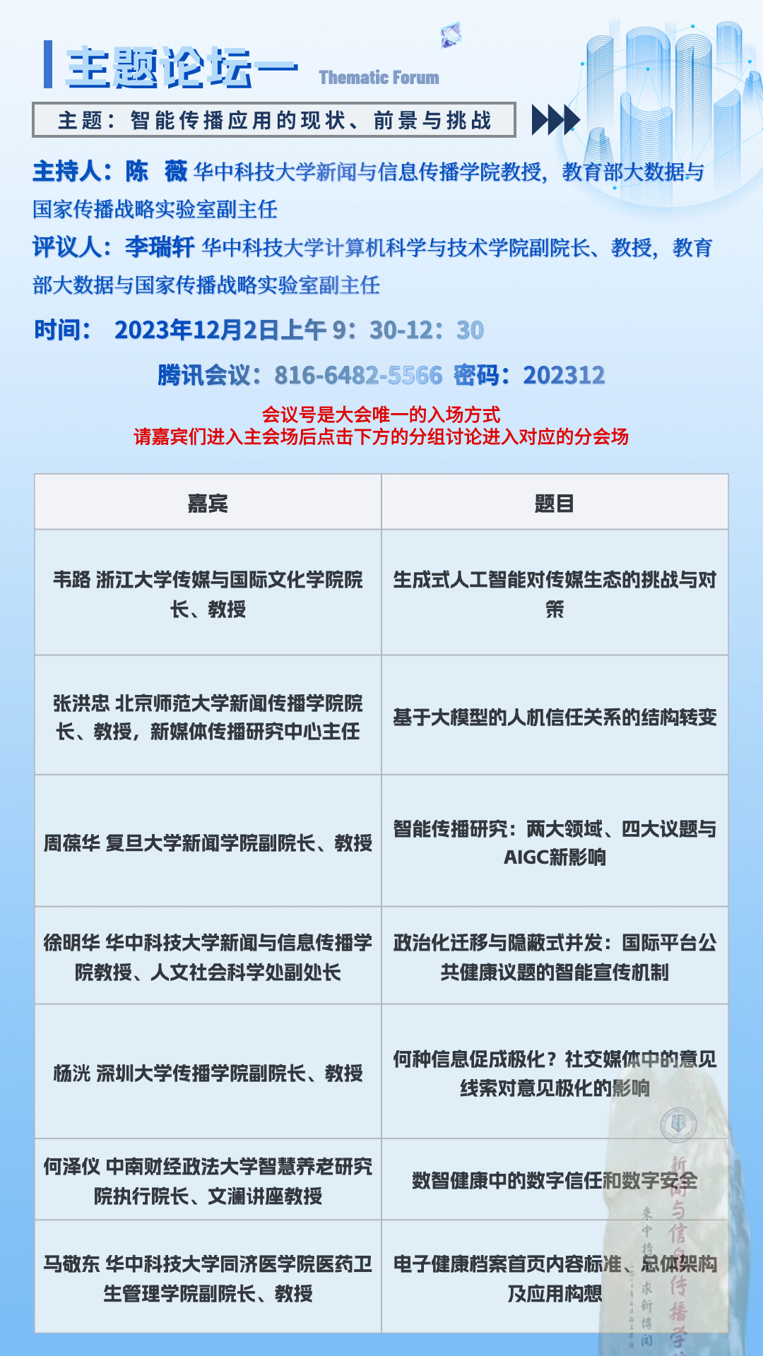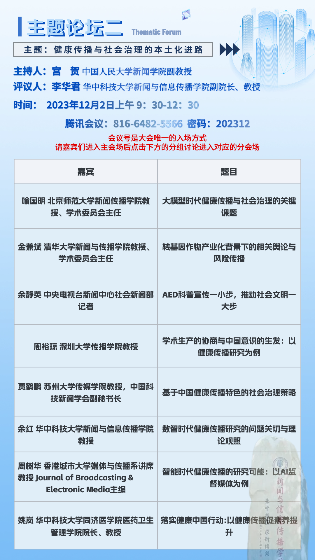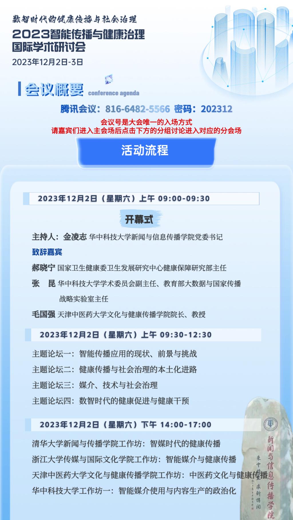为增进全人类健康福祉,推进社会治理现代化,以“深挖交叉议题,拓宽学术边界,创新学术进路”为宗旨,bw必威西汉姆联官方网站、教育部大数据与国家传播战略实验室、公共管理公司、医药卫生管理公司、计算机科学与技术公司及人工智能与自动化公司,将于2023年12月2-3日共同举办“2023智能传播与健康治理国际学术研讨会”,诚邀跨领域专家学者就“数智时代的健康传播与社会治理(Health Communication and Social Governance in the Age of Digitization and Artificial Intelligence)”这一主题展开深刻对话和探讨。