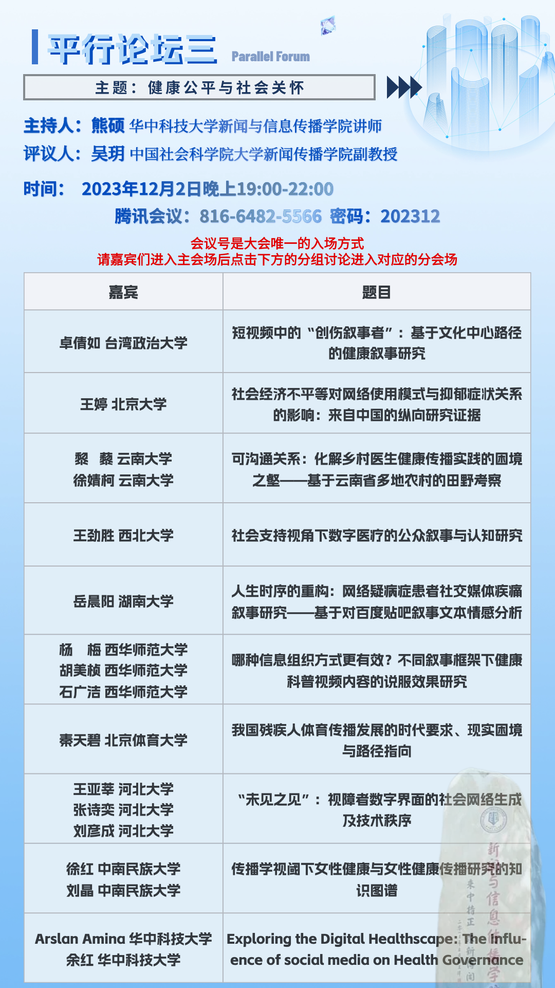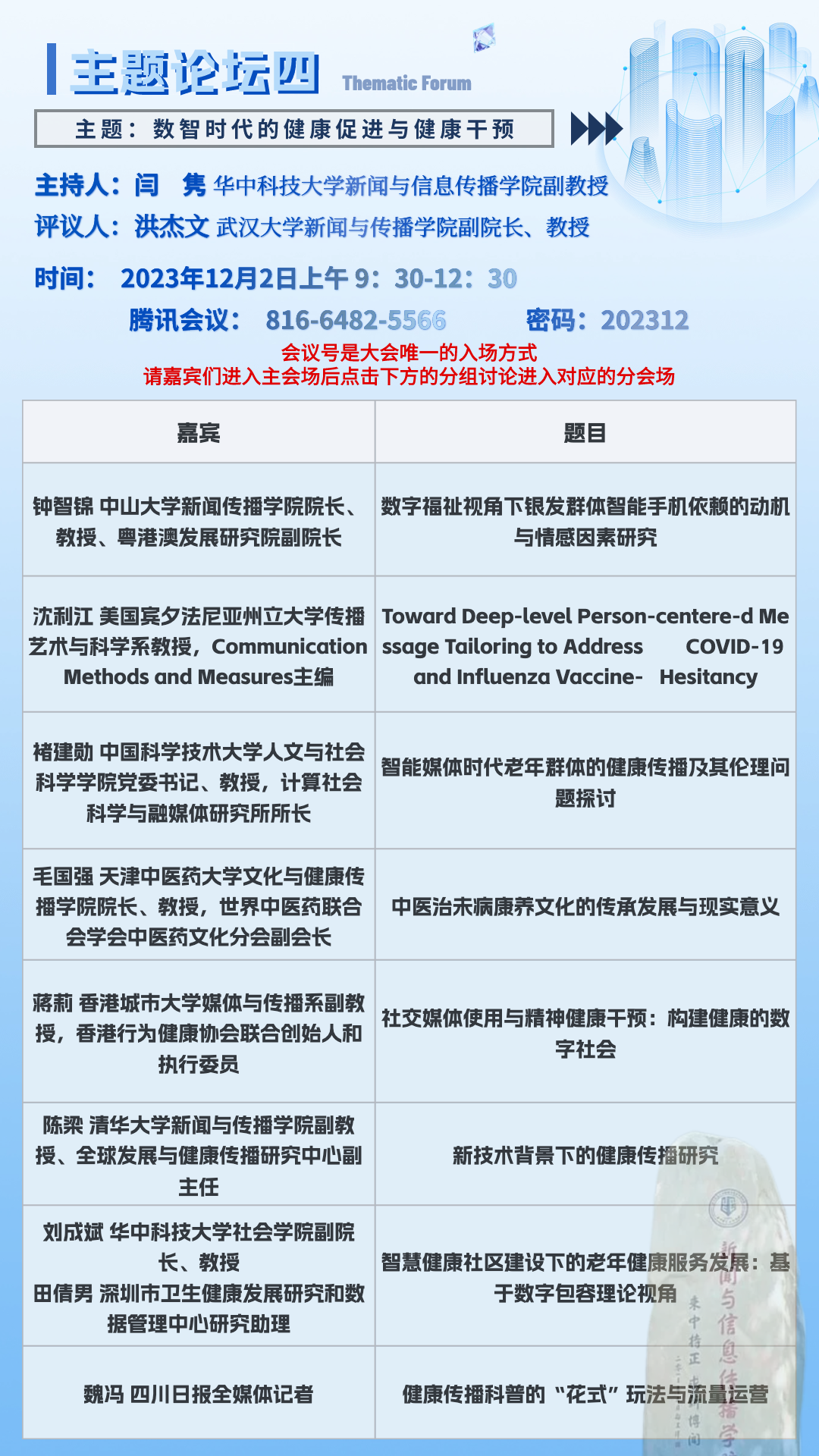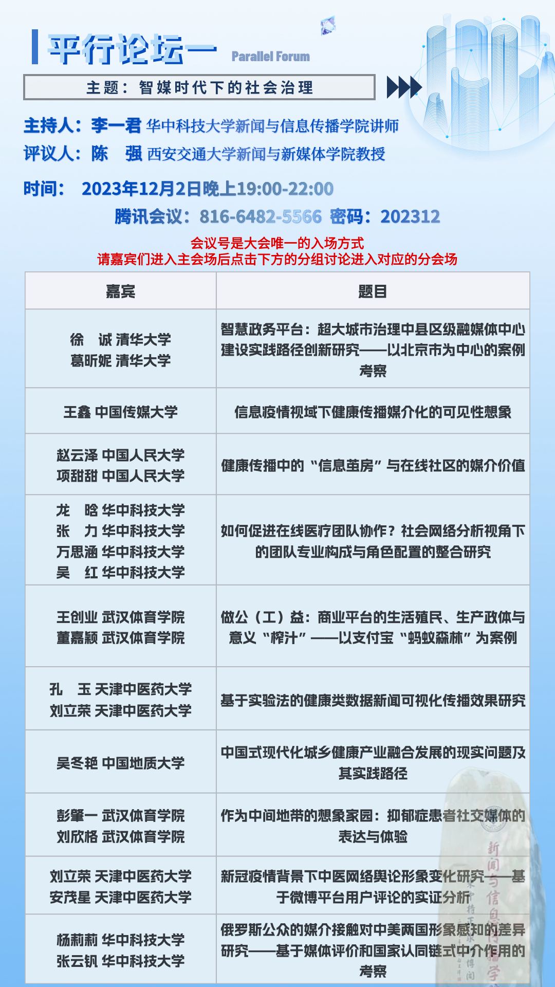 为增进全人类健康福祉,推进社会治理现代化,以“深挖交叉议题,拓宽学术边界,创新学术进路”为宗旨,bw必威西汉姆联官方网站、教育部大数据与国家传播战略实验室、公共管理公司、医药卫生管理公司、计算机科学与技术公司及人工智能与自动化公司,将于2023年12月2-3日共同举办“2023智能传播与健康治理国际学术研讨会”,诚邀跨领域专家学者就“数智时代的健康传播与社会治理(Health Communication and Social Governance in the Age of Digitization and Artificial Intelligence)”这一主题展开深刻对话和探讨。