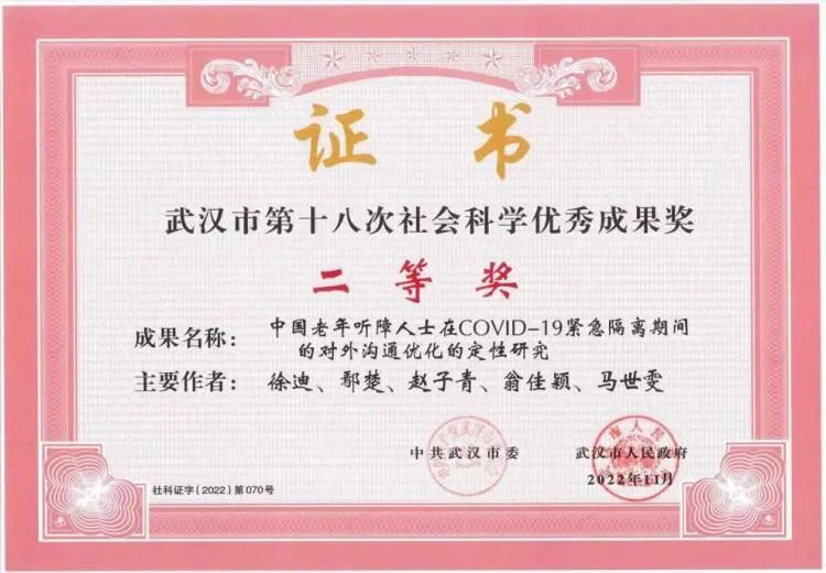 这一成果能够获得国际专业学术会议的认可,离不开公司的大力支持、徐迪副教授的悉心指导与团队成员的共同努力。自2020年3月国家级老员工创新训练项目立项以来,研究团队在点滴实践中不断深入探索,与“守语者”等三支公益组织建立稳定合作,并成为唯一一只授权在疫情隔离期间针对听障群体展开深入调研的国创团队,累计在该领域获得多项研究成果,并获得多项 誉。项目产出的调研成果《中国老年听障人士在COVID-19紧急隔离期间的对外沟通优化的定性研究》荣获武汉市社会科学优秀成果奖二等奖,受到中共湖北省委、湖北省残疾人联合会、湖北省红十字会表扬认可,湖北省委宣传部致函感谢。