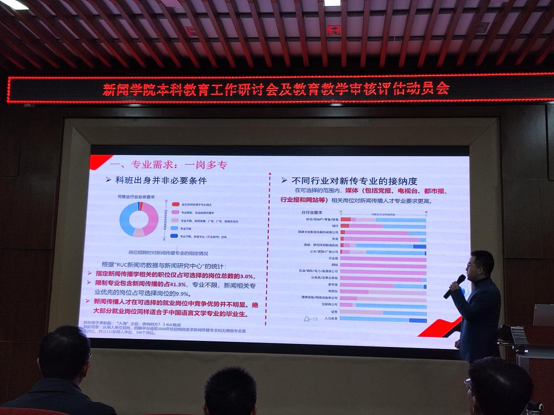 副经理李华君结合各单位调研数据深入探讨了OBE理念引领下的新闻传播教育。他强调新闻传播行业需要具备沟通能力、合作能力、数据分析能力、市场洞察力的全能型人才,在当下竞争和挑战不断的数字技术时代,新闻传播教育需要加强对多方位、全方面人才的培养。同时,他向全体教职工重点介绍了公司教育工作研讨会、“教学六个一”活动、审核评估自评自建工作的开展计划,明确任务,有的放矢。