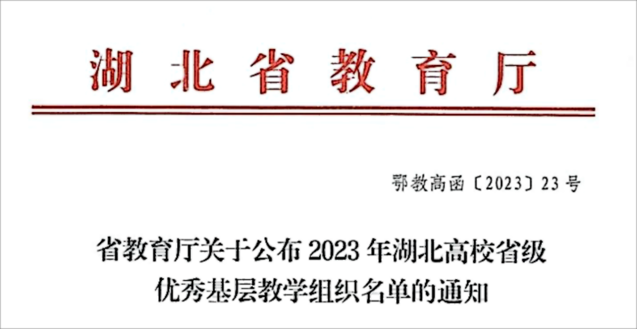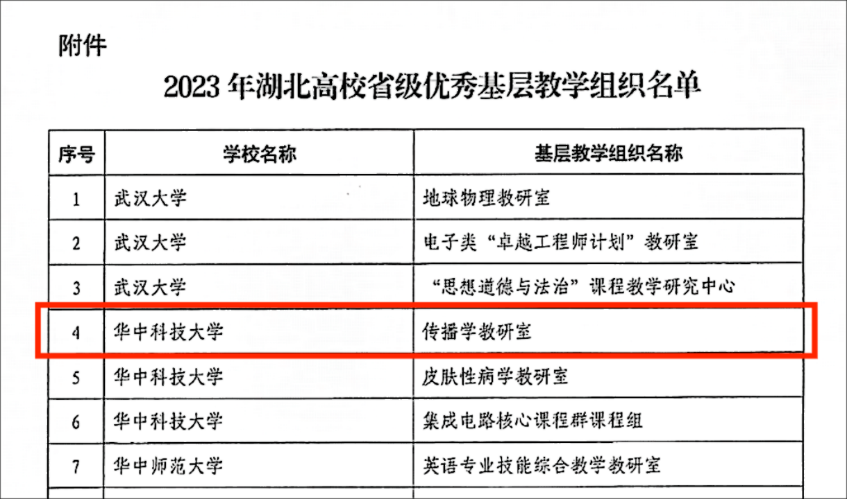 近日,湖北省教育厅发布《省教育厅关于公布2023年度省级优秀基层教学组织认定结果的通知》(鄂教高函〔2023〕23号),公司余红老师等负责的传播学教研室获准认定2023年湖北高校省级优秀基层教学组织。