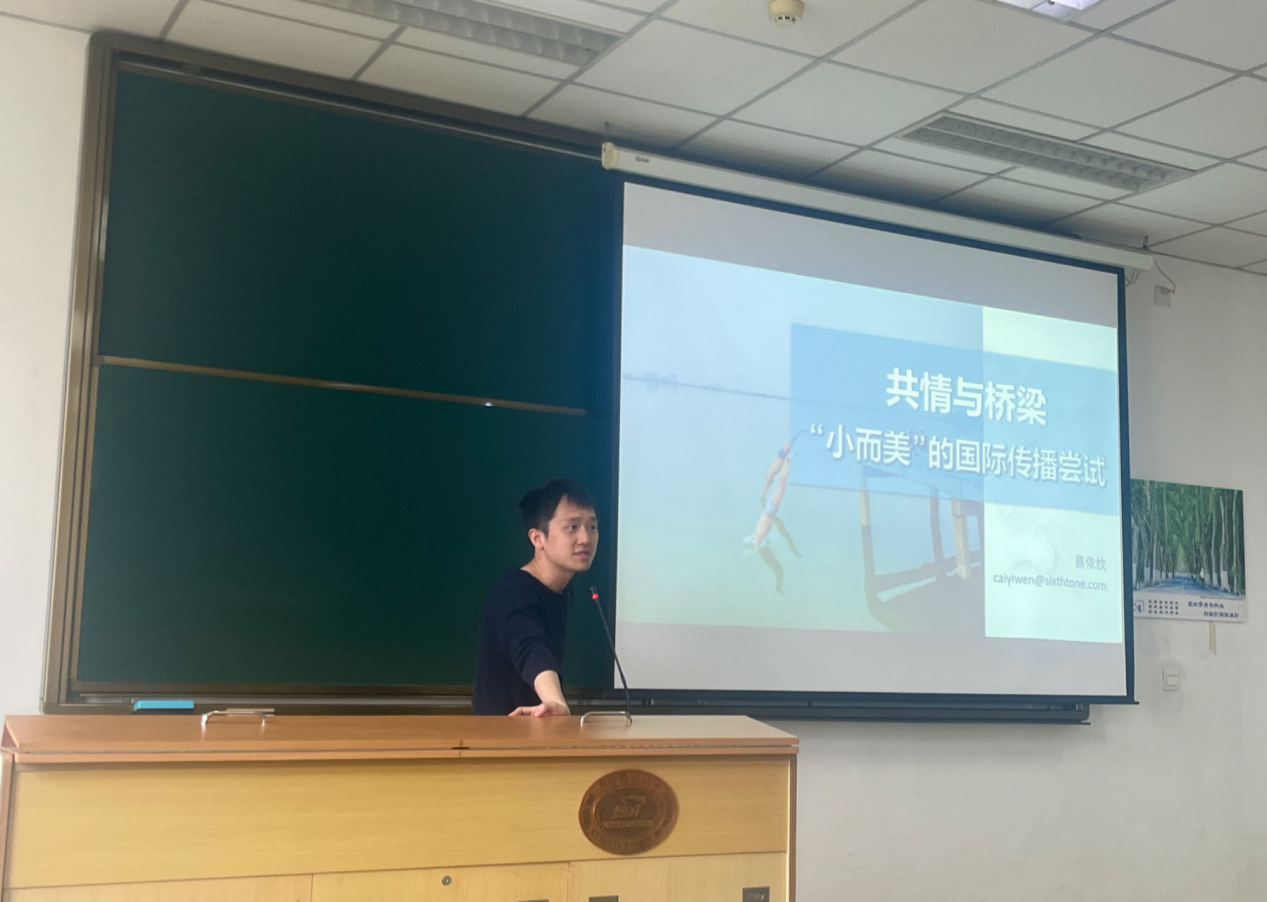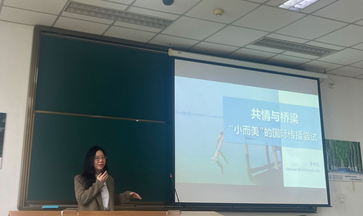 2024年4月19日上午,上海报业集团旗下“第六声”(Sixth Tone)首席编辑蔡依纹应公司王昀副教授邀约,惠临公司国际新闻导论课堂开展专题讲座。此次讲座以“共情与桥梁:小而美的国际传播尝试”为主题,从“第六声”编辑部的经验案例展开。