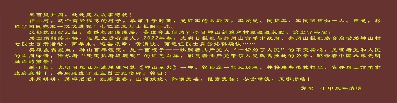 英雄旌霜履血,神山百年嬗变。一座丰碑背后,是一段历时两年、感召无数人的红色寻访,是燎原星火辉映下波澜壮阔的山乡巨变,是光明日报与神山村之间的不尽情缘......