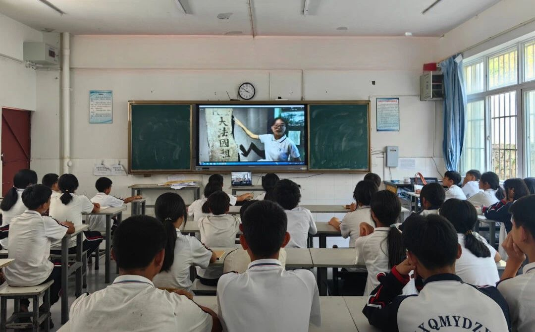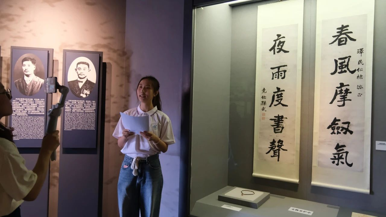 朗诵结束后,崔梦昕同学身着一袭绯红纱衣,如春燕展翅,踩着节拍翩翩起舞,用舞蹈缅怀革命先烈的丰功伟绩。随后,田娣萌、张露兮、董小诗三名“解说员”通过直播连线,与云南临沧蚂蚁堆中学的员工们展开了一场跨越2000公里的对话。她们向中员工们讲述着展馆陈列品背后的革命事迹,在娓娓道来中还原了这段波澜壮阔的历史进程。