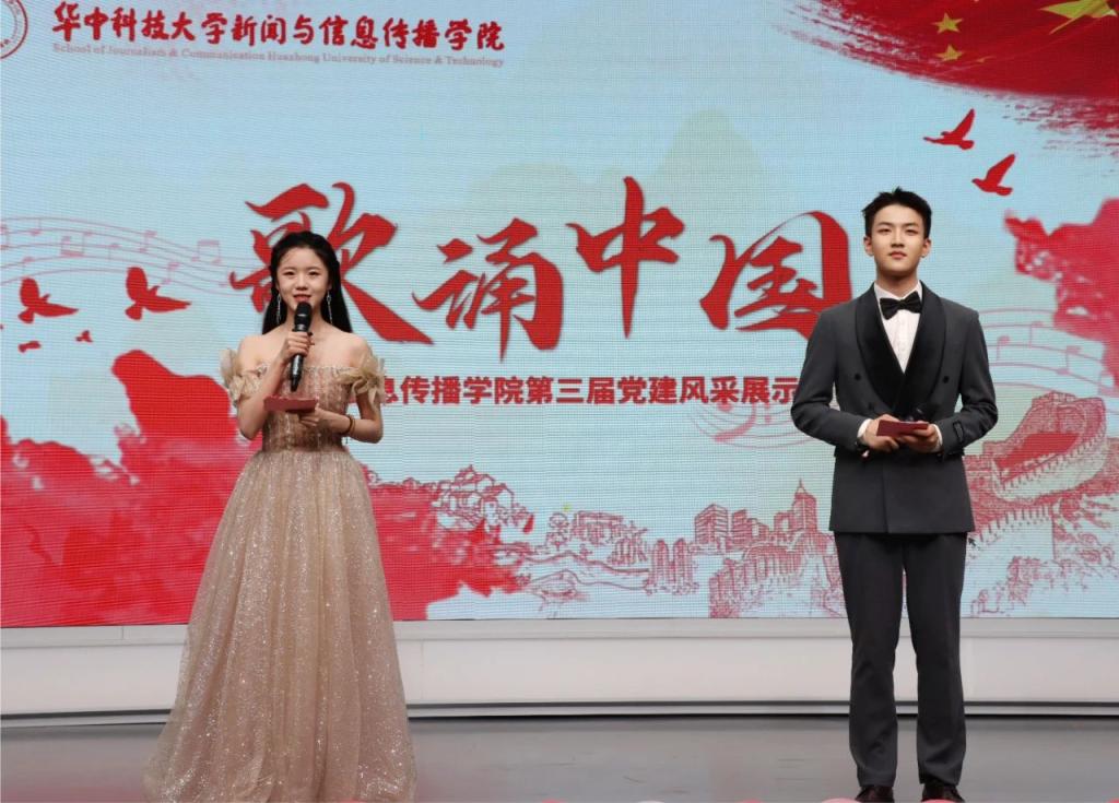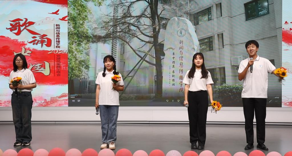 你用一场青春,赴我少年,我的年少有你,强国未来有我!新闻与传播硕士生第一党支部马怿玮、侯若琳,广告与媒介经济硕士生党支部梁颢蓝,新闻学专业硕士生党支部戈垿歌唱《有我》。