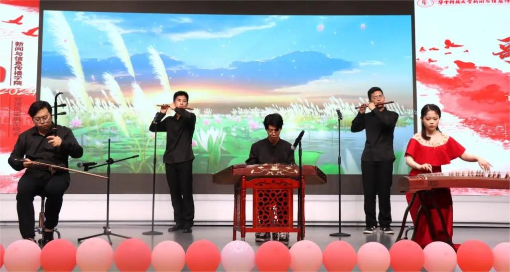 一曲洪湖水,悠悠几代情。新闻系2021级本科生党支部李怡然、机械公司陈以诺、能源与动力工程公司李昱甫等带来民乐合奏《洪湖水浪打浪》,抒发深厚的民族情感和集体记忆。