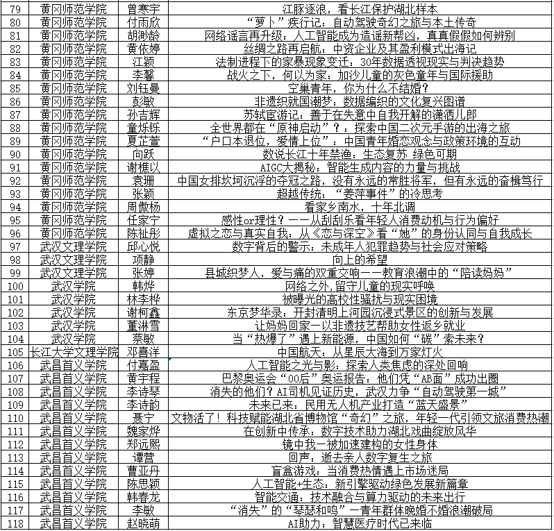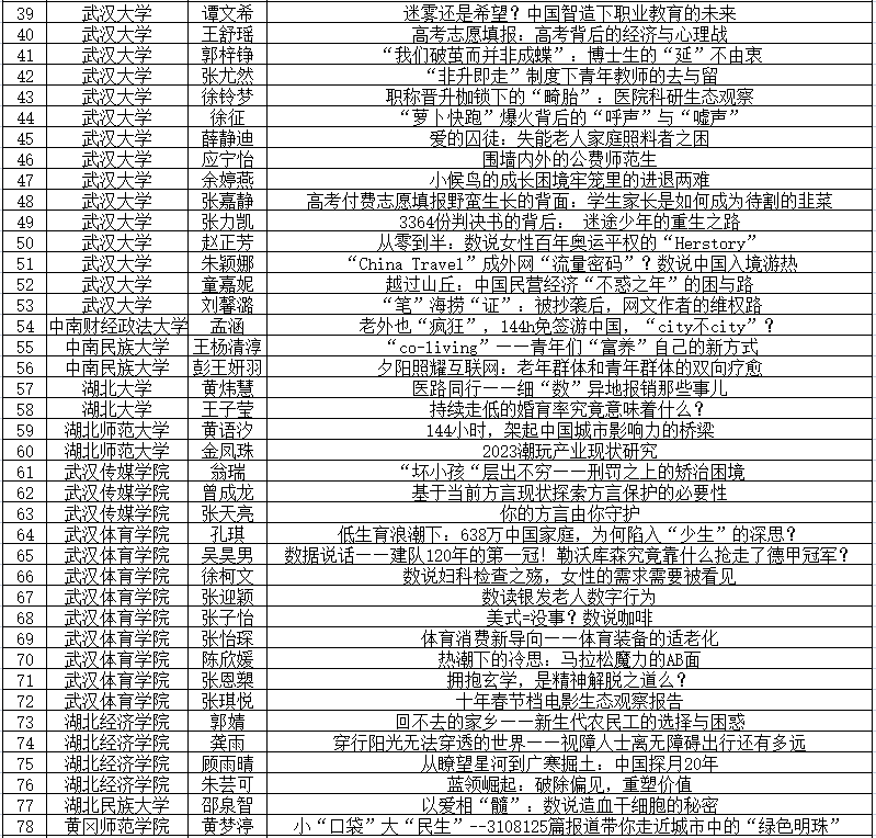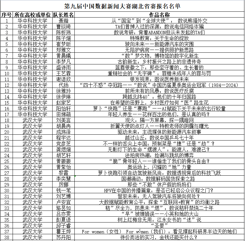 截至8月26日,经过前期报名与作品提交,经湖北省赛区组委会复审核查,第九届中国数据新闻大赛湖北省赛共有118份数据新闻作品报名成功,现予以公示。
