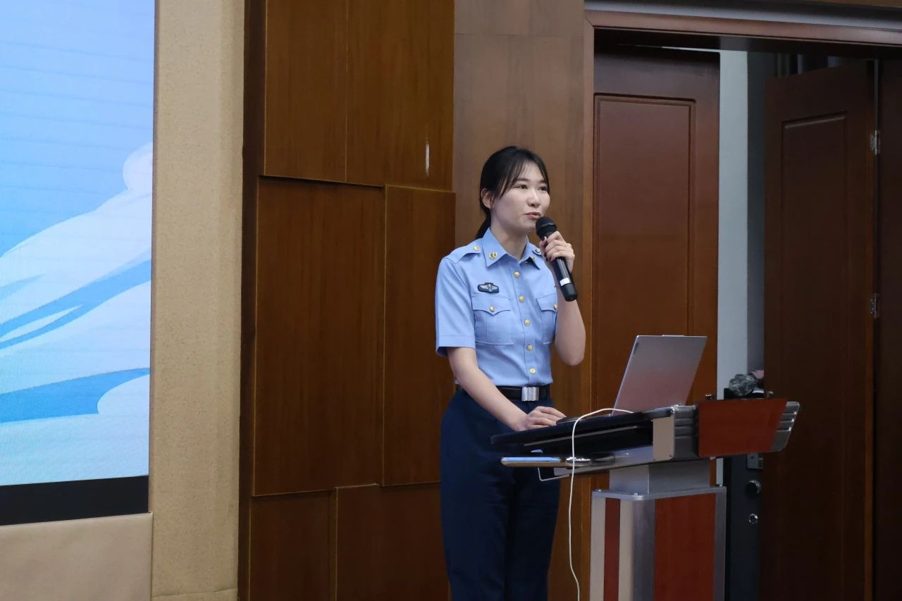 在榜样力量环节,退伍老员工、优秀员工党员代表周钰以《乘风随舒卷,摇曳入晴空》为主题,向大家讲述了自己作为空降兵的军旅经历。受到曾参加抗美援朝的爷爷影响,周钰选择在保研后应征入伍,完成了跳伞任务,担任军史馆讲解员与军宣传处责任编辑,并荣获“四有”优秀士兵等荣誉。她讲述了空军英雄王清珍的故事,通过“伞花绽放”的象征,展现了空降兵在风雨中勇敢拼搏的精神,也让她更加坚定了对军旅生活的敬畏与自豪。