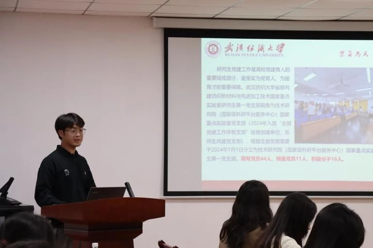 在参观完纺织科技馆之后,双方支部开展员工党建工作交流会。武汉纺织大学国重实验室研究生党支部书记孙文以聚力“四育四建”工作法、推进研究生党支部高质量发展为主题,从思想育人、科技育人、实践育人、组织育人四个方面分享建设高质量党支部的措施,“党支部继续秉持科研创新精神,深度融合党建与科研,紧紧围绕立德树才根本任务,为国家培养有用的人才。”始终是支部建设的根本宗旨。