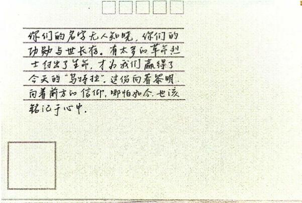 活动现场气氛热烈,在场同学纷纷在明信片上写下了自己的心得感受,每一句感言都蕴含着他们对那段峥嵘岁月的敬畏,对当下幸福生活的珍视。