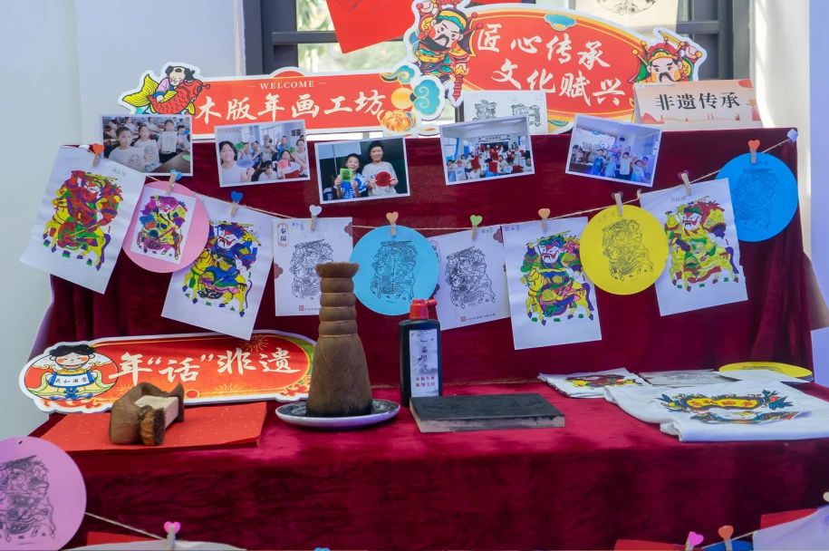 非遗传承的展台前,实践队代表黄贞榕正引导师生动手体验木版年画的制作流程,她们带着木版年画这一非遗“老手艺”走进襄阳市中心小学,同时也带回了华科大的员工社区,让非遗在体验中传承发扬。