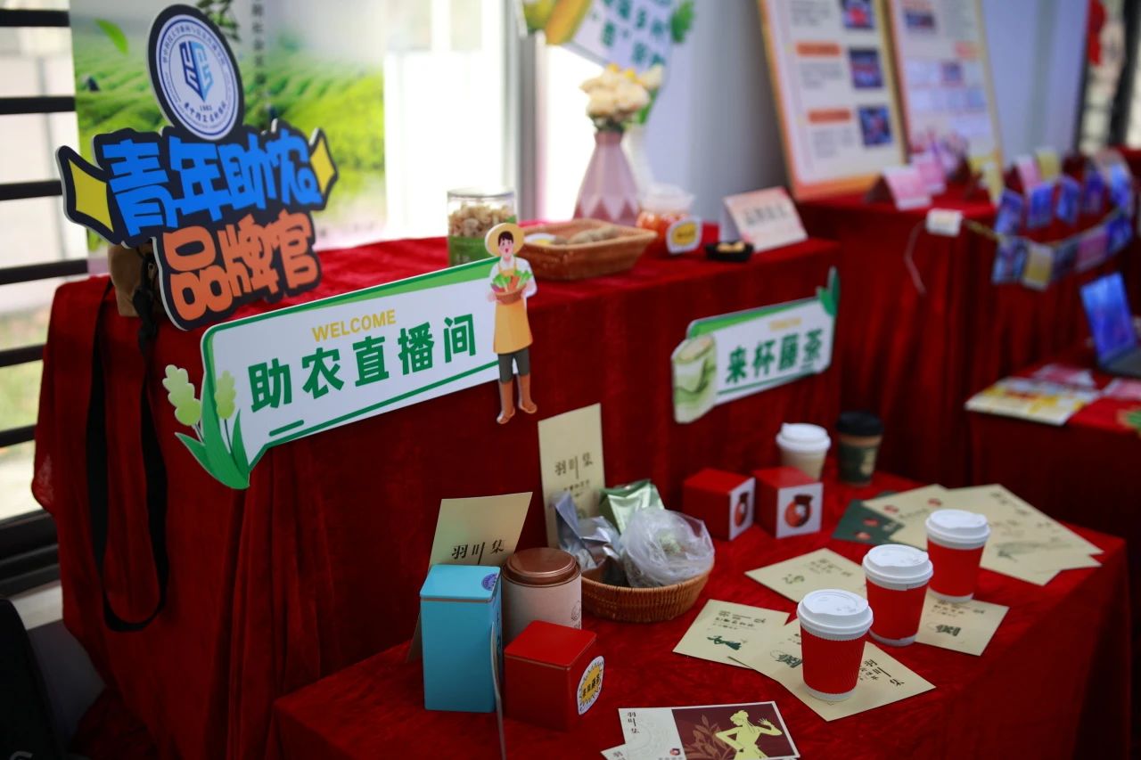 品牌助农的展台前,一场现场直播正在进行中。青年品牌官夏茁榛身着民族服饰,为直播间的观众们介绍着藤茶的种植、采摘、加工过程,以及恩施小土豆、凤头姜等农特产品。“这是我们从恩施来凤带回的藤茶,茶叶和茶杯的包装也是由实践队员设计制作的。”
