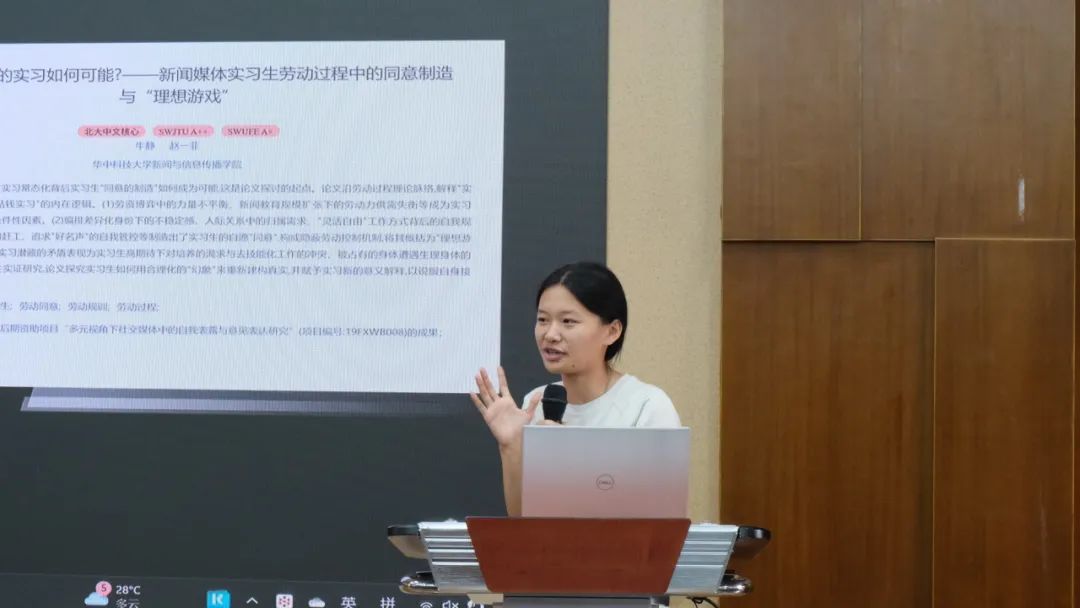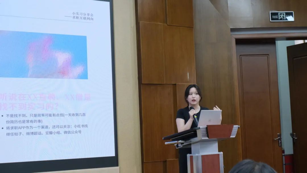 李晶晶则将重点讲解岗位选择,她结合自己在电视台实习的亲身经历,讲述了如何根据个人兴趣和岗位工作要求筛选实习岗位,分享了在实际工作中遇到的挑战与收获,鼓励同学们多尝试、多积累,找到最适合自己的发展路径。