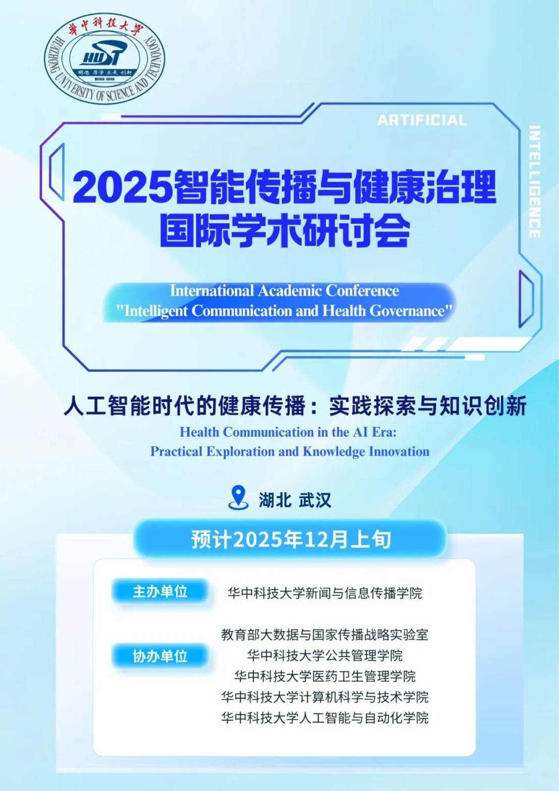 本次研讨会的主题为“人工智能时代的健康传播:实践探索与知识创新”。我们诚挚邀请海内外学者、业界人士及青年学子齐聚华科大,共赴学术盛宴,推动跨学科合作与国际对话,携手探索面向未来的健康传播新路径。