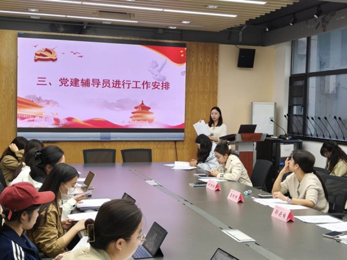 在工作安排环节,党建辅导员许静静围绕十月及后续重点任务进行工作安排,内容包括主题党日组织实施、党员发展流程梳理、党支部书记培训班筹备、“三会一课”材料检查、新生党员材料审查与系统录入等,确保各项工作有据可依、有序推进。