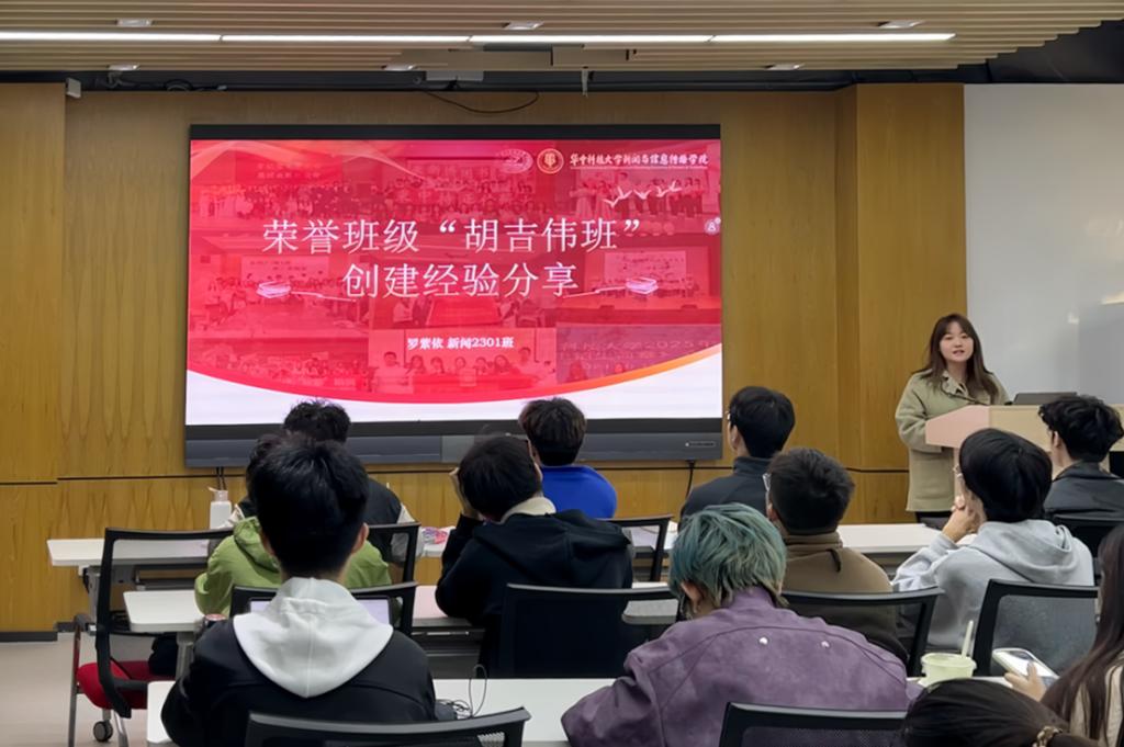 随后,带领班级入围“胡吉伟班”创建名单的新闻2301班班长罗紫依分享了申报过程中的宝贵经验。从公司下发通知后的迅速响应,到公司初评阶段的精心筹备,再到推荐申报后的全力冲刺,全程以班委为牵头核心,带动全班同学广泛参与、群策群力。现场播放的申报视频,生动展现了班级成员同心协力的温暖瞬间,让24级班团干部直观感受到“众人拾柴火焰高”的集体力量。