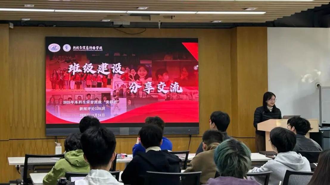 会议伊始,来自新闻评论2201班的杨丽作为荣誉班级“黄群班”班长,分享了班级建设的心得。她强调,班委是班级的“主心骨”,但一个优秀的班级离不开每一位成员的参与。同时,她结合“黄群班”申报经历,详细拆解了班委工作的核心方法:申报前需牵头制定清晰规划与任务清单,明确时间线、压实责任链,从申请材料准备到现场展评打磨,每一步都要凝聚班委智慧、汇集全班力量。