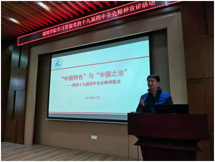 陈廷柱以“中国特色”与“中国之治”为主题,从“中国之治”的愿景、 “中国之治”的优势、“中国之治”的任务,“中国之治”的能力四个方面系统梳理了十九届四中全会的重要成果;从“时代昭示”“实践昭示”“理论昭示”“国际昭示”四个方面系统阐述了十九届四中全会的重大意义。他认为从“中国特色”看“中国之治”,就是从破局之治走向特色之治,从大国之治走向强国之治。